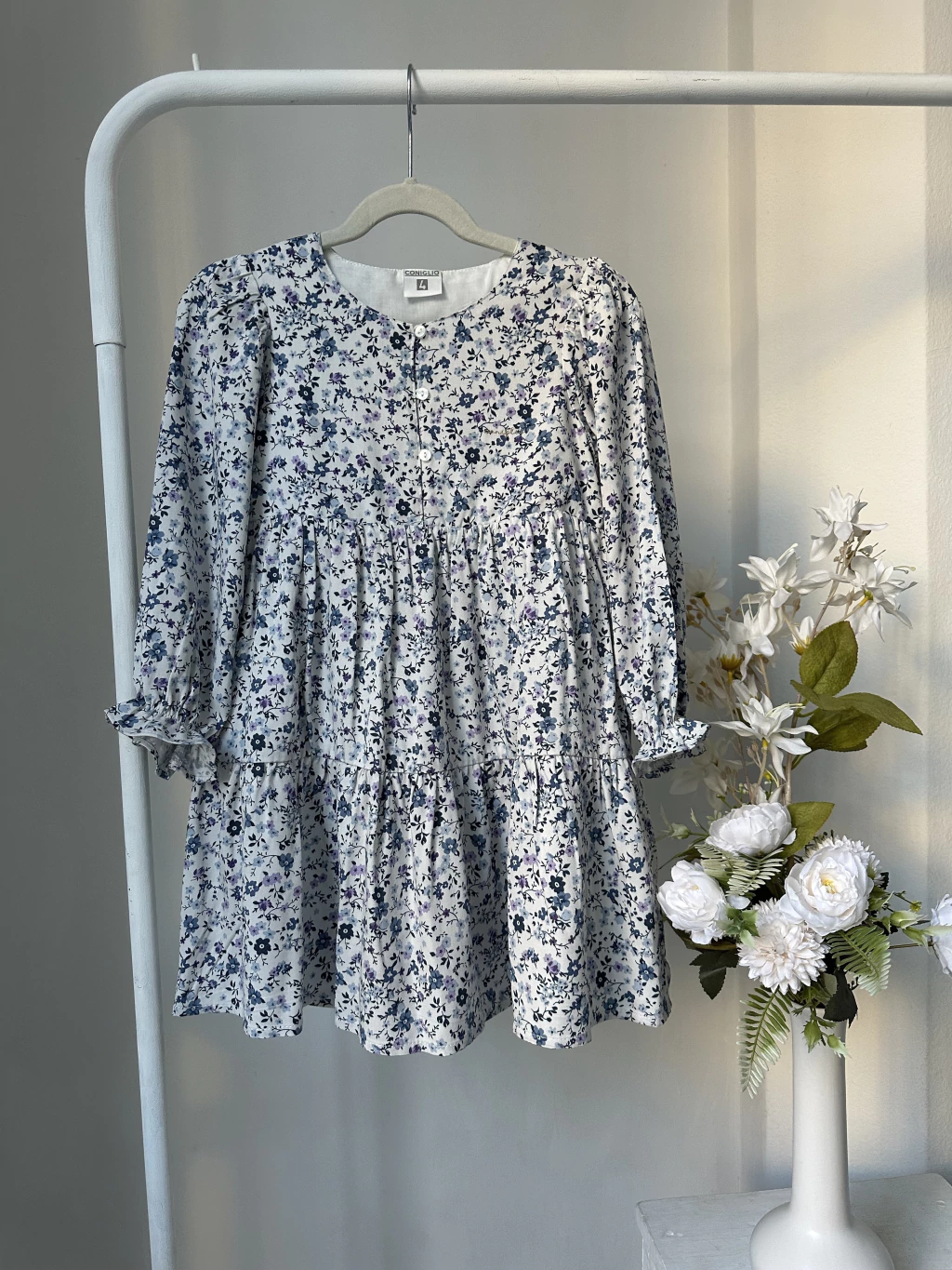 Vestido de nena confeccionado en algodón estampado de flores. Tiene botones adelante, forro y elástico en los puños. Marca Coniglio.